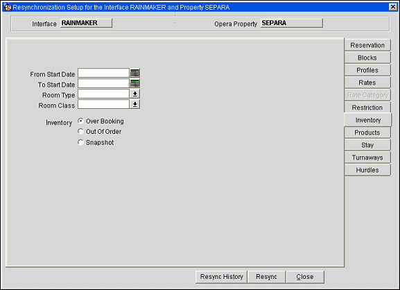 Inventory. You can select between an Overbooking, Out Of Order or Snapshot resync by checking one of the option buttons. When you select the Out Of Order option button, the field Room Class is removed from the screen.