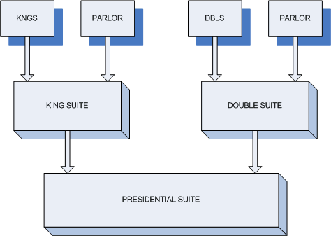At the property level, OPERA allows you to configure the room types associated with Component Room room types. When you configure rooms (see Room Tab for details on room configuration) you may assign the physical room numbers of each room type to create the actual component rooms.