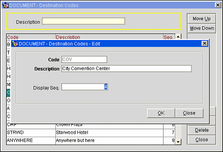 From the Destination Codes screen you may add new destination codes and edit existing destination codes. To add a new destination code, select the New button. To edit an existing destination code, highlight your choice and select the Edit button. The Destination Codes - New or Destination Codes - Edit screen appears.
