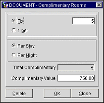 The Complimentary Rooms screen allows you to specify the number of complimentary rooms, if any, that will be available for this business block. It also allows you to specify the value of the complimentary rooms.