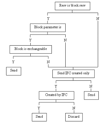 The following flow chart represents the data flow for Block Reservation Business events based upon the setting for the OXI_GENERIC > SEND IFC CREATED ONLY parameter and the OXI_BLOCKS > SPECIFIC BLOCK EXCHANGE parameter.