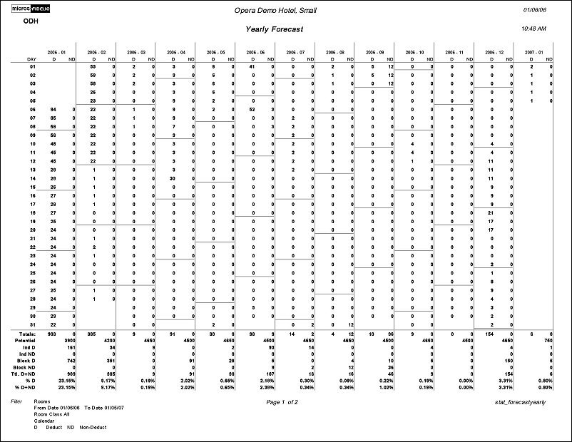 The yearly forecast report displays all reserved rooms in a summary breakdown of either Deduct(D) or Non-Deduct(ND). The Reservation Type determines whether the Room reserved is of a Deduct or Non Deduct Status. The figure represents both Reservations and rooms held against a Block, but does not include block rooms when the block status is INQUIRY, REGRET and LOST. The report output is displayed by month, with a separator line after each occurring Sunday to assist in reading the report.