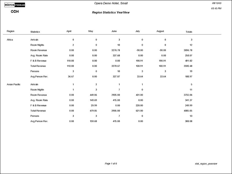 The Region Statistics Year View report will display a breakdown per month, for the current year, a breakdown of Reservation Arrivals, Room Nights and Revenue production per configured Region.