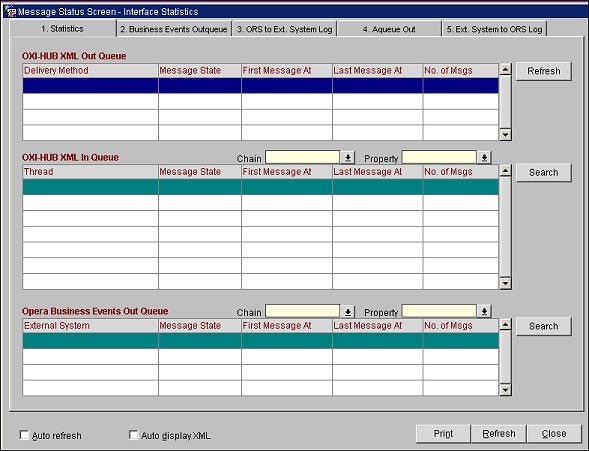 This screen displays all messages that have been generated from the ORS or OPERA PMS systems and their current status of being processed. The Statistics screen is broken into four areas for the users ability to see how the ORS or OPERA PMS’s business events are being processed. Also what the status is of those transmitted messages.