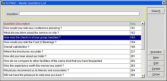 When you return to the Master Questions List screen, you can set up the list of responses for this question. To do so, select the Answers button. The Answers screen appears.