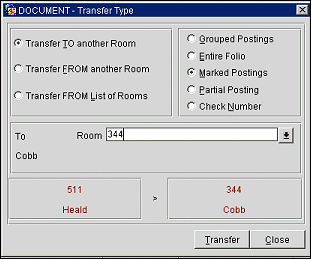 Marked Postings. Marked Postings appears when you have chosen to Transfer TO Another Room. In this case, you must have already selected the transactions to be transferred from the current Billing screen. Select the Transfer button on the Transfer Types screen to proceed with the transfer.