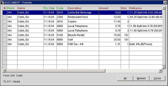 This screen shows complete details for each transaction on the sending guest's bill. The list includes transactions for all the rooms you have chosen if you are performing a Transfer FROM a List of Rooms.