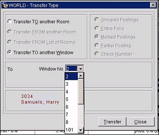 Note: If you transfer the Entire Folio using the Transfer TO Another Room option, all postings in all windows are transferred to the receiving guest's bill, regardless of which window is active for the sending guest.