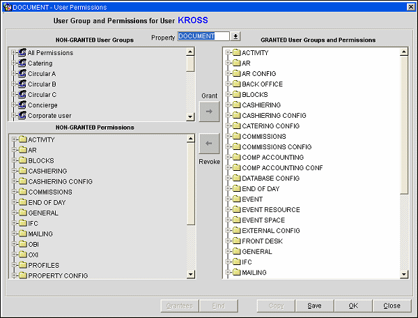 Configuring permissions for multiple properties is done in much the same manner as configuring permissions for a single property. The primary difference is that for each property the Property selection field must be set to the appropriate property for the permissions to be set for that property. (Only the properties to which the user has property access will appear in this list of values.) For example, user KROSS is granted access to HOTEL1, HOTEL3 and HOTEL5, each of these properties would need to be selected in the Property selection field prior adding and/or removing permissions or user groups. Once the permissions are set for the selected property, select the Save button to proceed with configuring the next property.