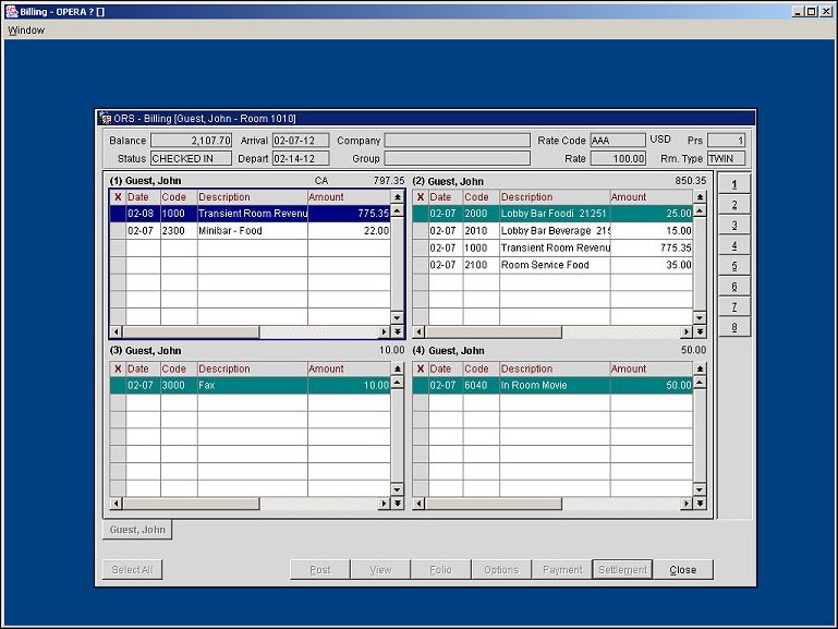 Available when the OPR_<version number> OPERA Reservation System and the OPP_<version number> OPERA Property Management System licenses are active, a view-only display of the PMS Billing screen can be viewed from ORS by users that have the correct access configuration setup and have been granted the Reservations>PMS Folio Display user permission.