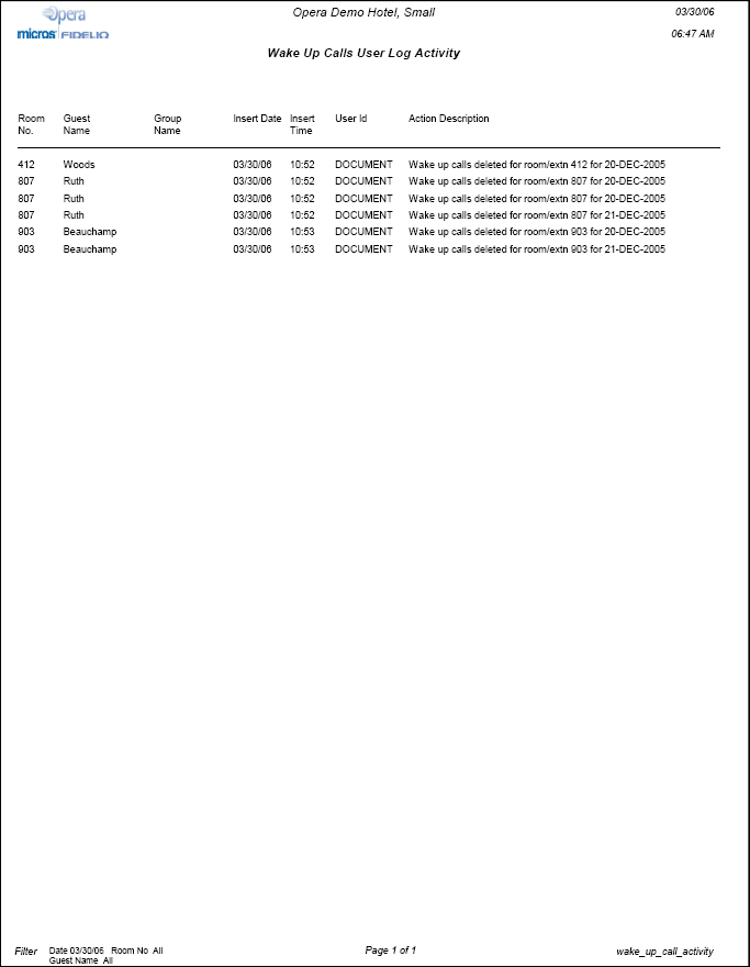 The Wake Up Call report displays all logged and deleted wake up calls for a room number, specific date, or specific guest. This information is pulled directly from the user activity log.